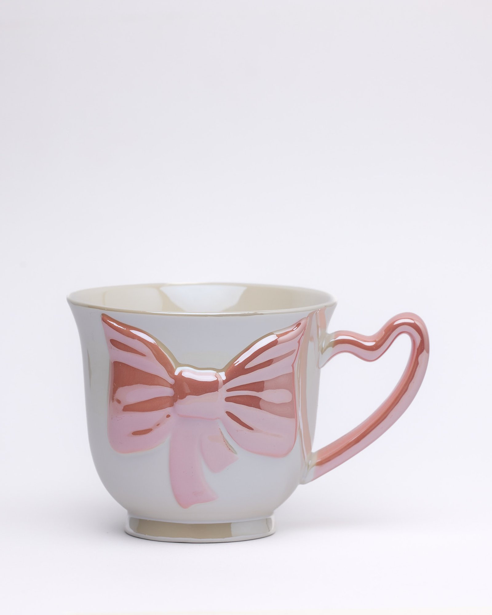 Κούπα κεραμική με ανάγλυφο φιόγκο σε παστέλ ροζ απόχρωση και ρομαντικό χερούλι σε σχήμα καρδιάς .Με μαργαριταρένια λάμψη και φινετσάτη καμπύλη χαρίζουν μια παραμυθένια αισθητική. Χωρητικότητα 480ml.